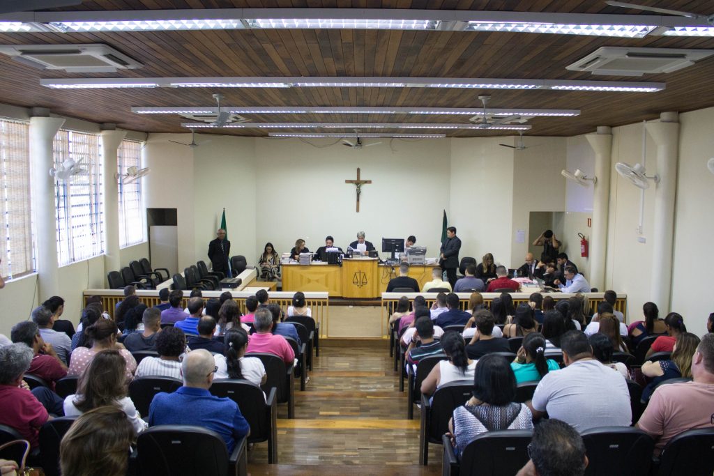 Apesar do horário, o plenário do fórum está lotado. O acesso está sendo controlado por senha. No portão, o segurança permite que uma pessoa entre apenas quando outra sai. Há fila de pessoas querendo entrar. Outras, apenas se aglomeram no lado de fora do portão. Apesar do grande comparecimento, o processo aconteceu de forma tranquila, conforme as regras definidas pelo juíz.