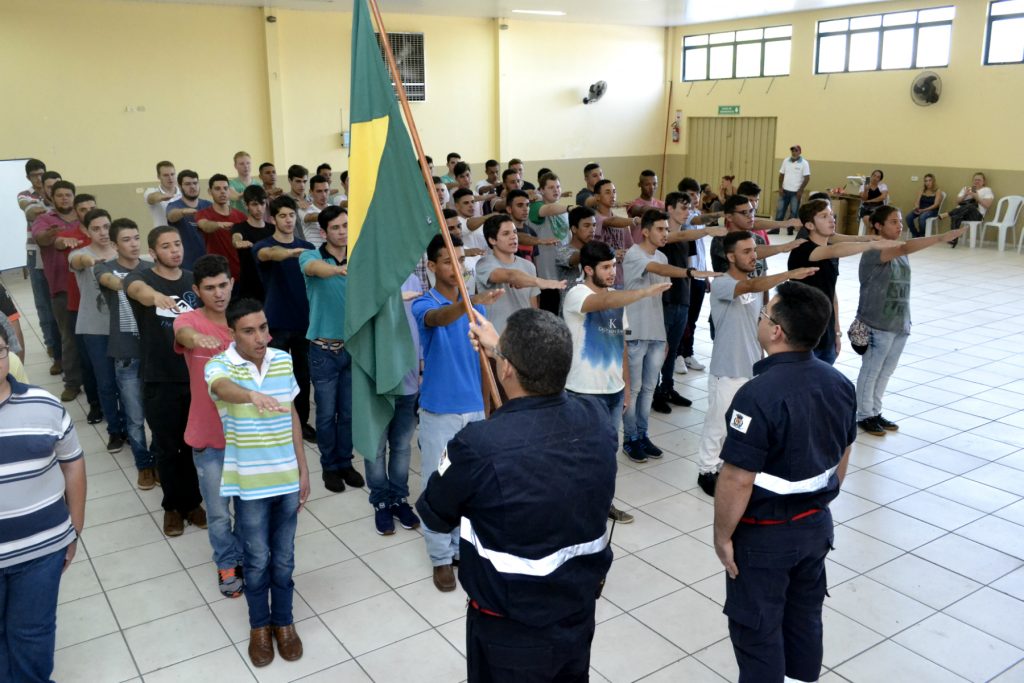 Devidamente perfilados, os 78 rapazes dispensados prestaram seu compromisso junto ao Pavilhão Nacional, acompanharam a execução do Hino Nacional Brasileiro e receberam das autoridades presentes os Certificados de Dispensa de Incorporação.