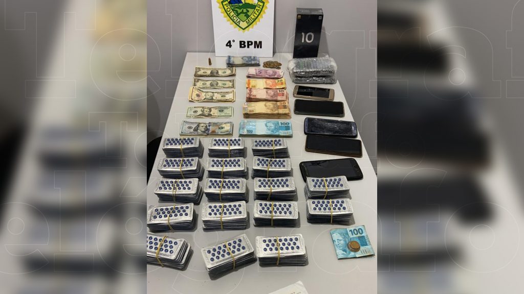 Com eles estavam vários produtos e cédulas de dinheiro, identificados pelos sacoleiros como fruto do roubo. Uma passagem da empresa de transporte e uma munição calibre 9mm também estava em posse dos suspeitos.