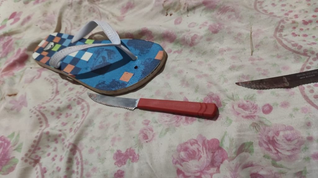 No quintal, a equipe flagrou o momento em que um homem pulou o muro com uma faca na mão. Ele conseguiu fugir porque os policiais avistaram a criança ensanguentada no chão da sala, e passaram a socorrê-la.