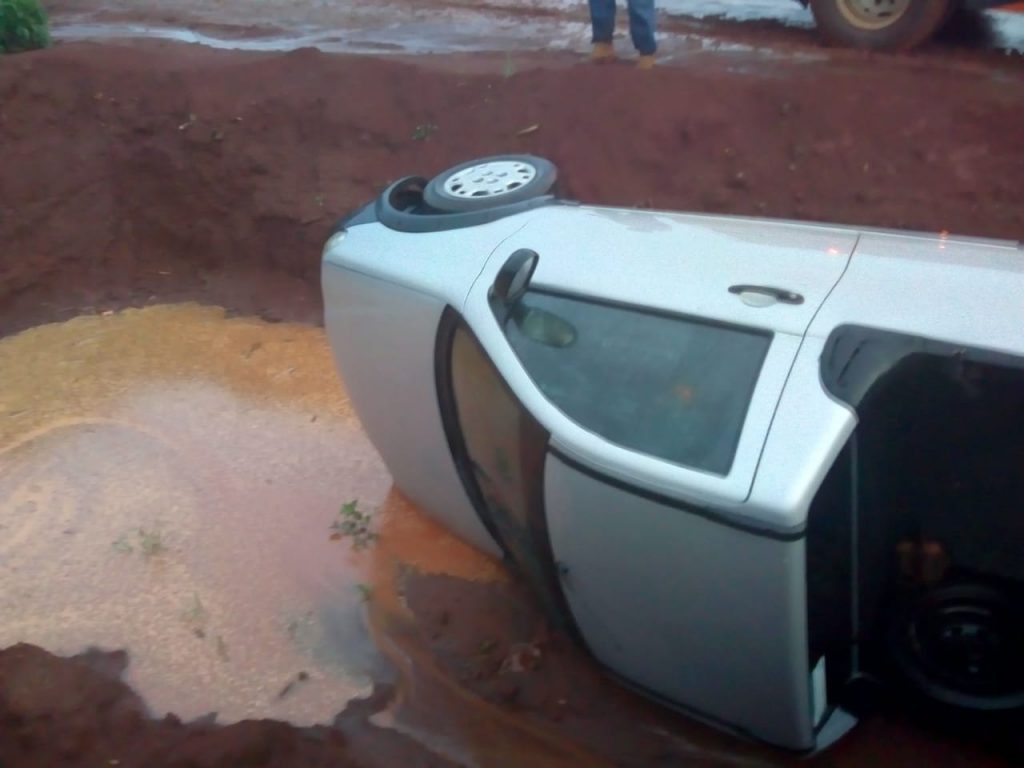Com ajuda de pessoas que estavam no local, os bombeiros retiraram o veículo. O objetivo foi evitar maiores danos ao proprietário, já que o nível da água da chuva na “caixa” poderia subir.