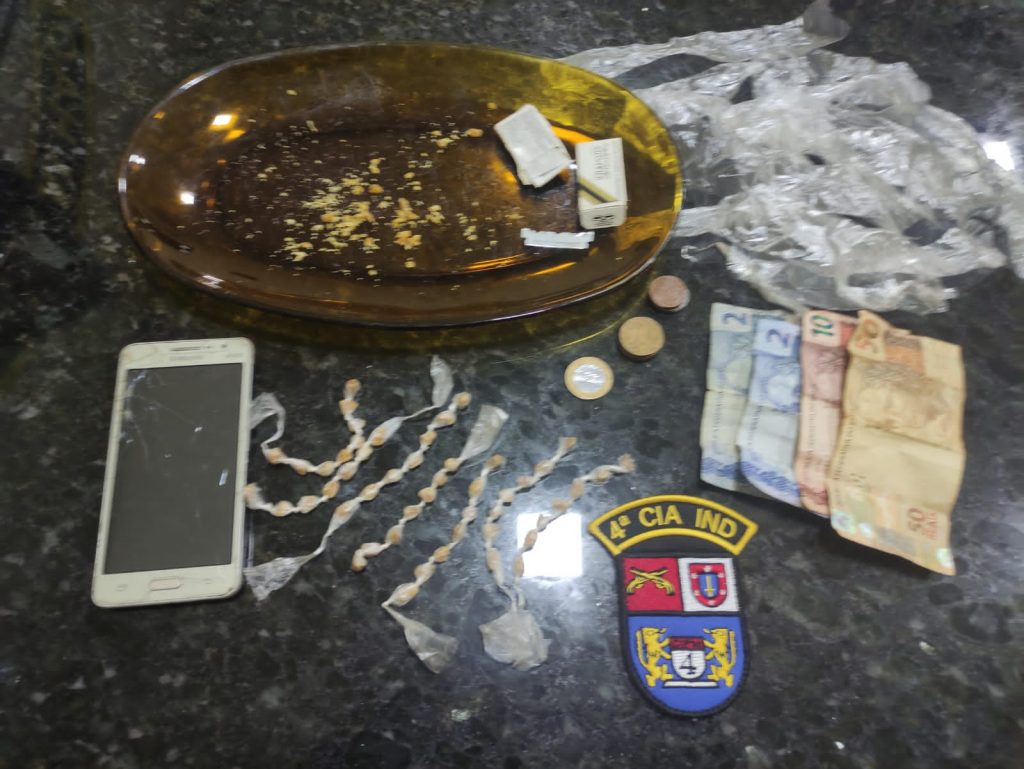 Durante a averiguação, foram encontradas 50 porções de crack, além de materiais utilizados no embalo do produto, um recipiente de vidro e lâminas contendo resquícios da mesma droga.