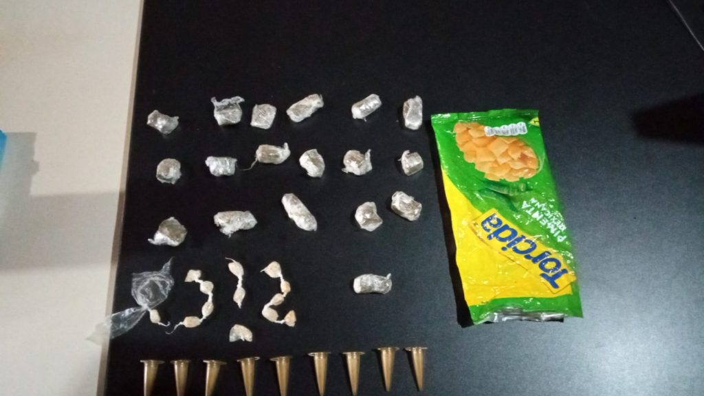 Os policiais pegaram o objeto e encontraram dentro dele 18 porções de maconha, 13 de crack e nove pinos de cocaína. Os entorpecentes foram levados para a delegacia.